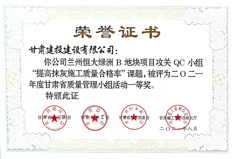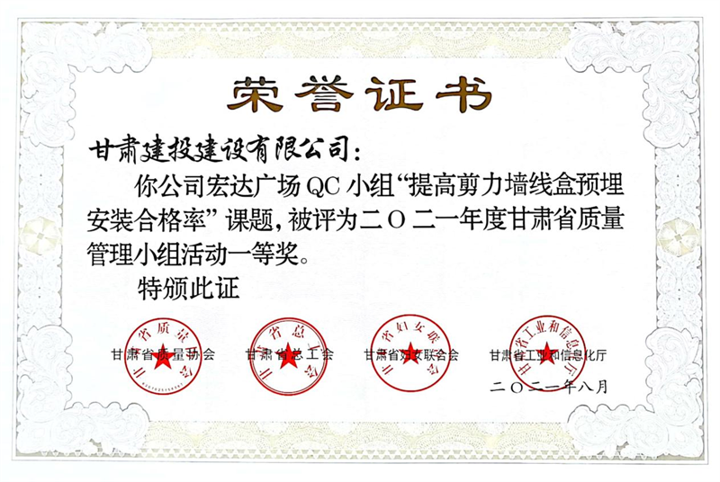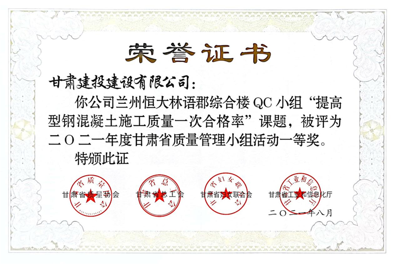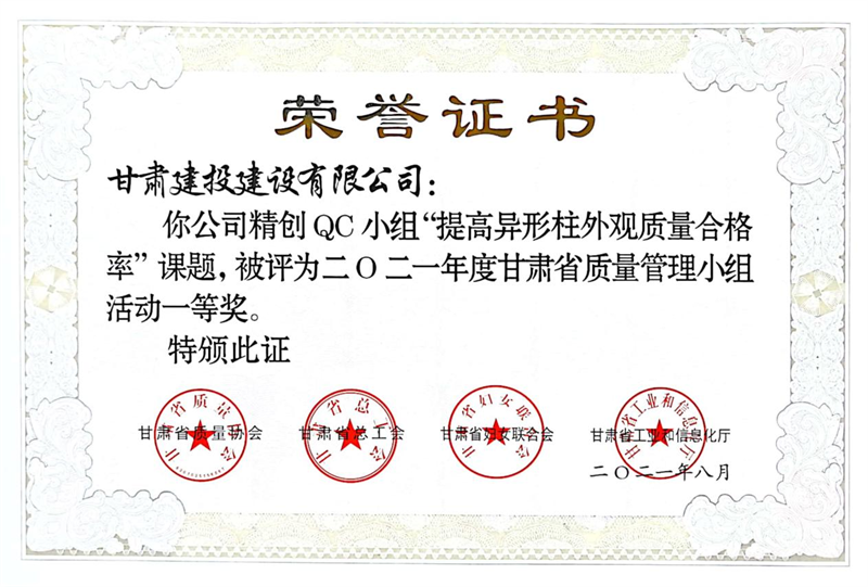 建設(shè)公司申報(bào)的36項(xiàng)QC成果中,1項(xiàng)成果獲全國(guó)“工程建設(shè)質(zhì)量管理小組二類(lèi)成果,1項(xiàng)成果獲“甘肅省質(zhì)量管理小組活動(dòng)最高榮譽(yù)獎(jiǎng)——特等獎(jiǎng)”、14項(xiàng)成果獲一等獎(jiǎng)、19項(xiàng)成果獲得二等獎(jiǎng)、2項(xiàng)成果獲得三等獎(jiǎng)。建設(shè)公司榮獲“2021年度甘肅省質(zhì)量管理小組活動(dòng)優(yōu)秀企業(yè)”稱(chēng)號(hào),這是繼2019年后,公司連續(xù)三年獲此殊榮。