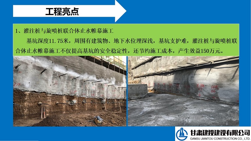 甘肅煤田地質局綜合普查隊地球物理勘查科研基地項目共采用了《建筑業10項新技術(2017版)》中的6個大項16個小項,在施工管理過程中創新應用實施了高壓旋噴樁止水帷幕施工技術、施工現場照明聲光控組合控制等技術。