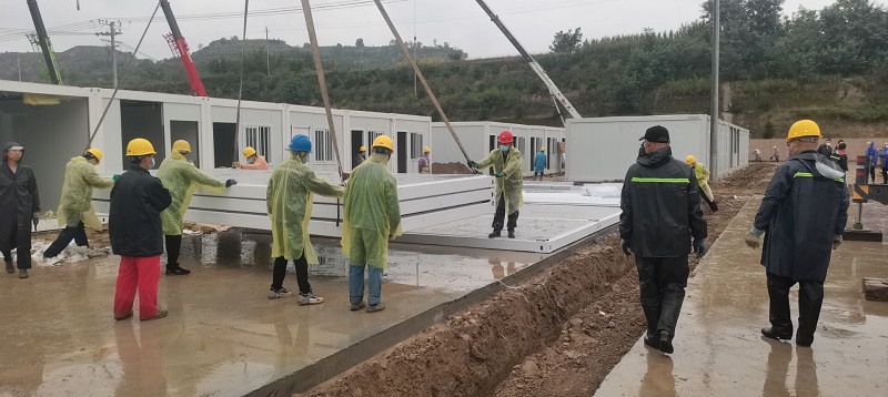 因疫情和連續降雨天氣,給施工造成一定困難,項目部全體人員風雨里、泥濘中拼搏共進,分秒必爭,加快“逆行”腳步,顧不得休息,24小時不間斷輪班施工,全力以赴,統籌協調人力、物力、機械。截至目前已完成100間集裝箱的框架安裝和40套墻板安裝任務,衛浴設施及水電也在緊張施工過程中,剩余未完成工程量的材料已全部發貨,其他要素正逐項配齊。