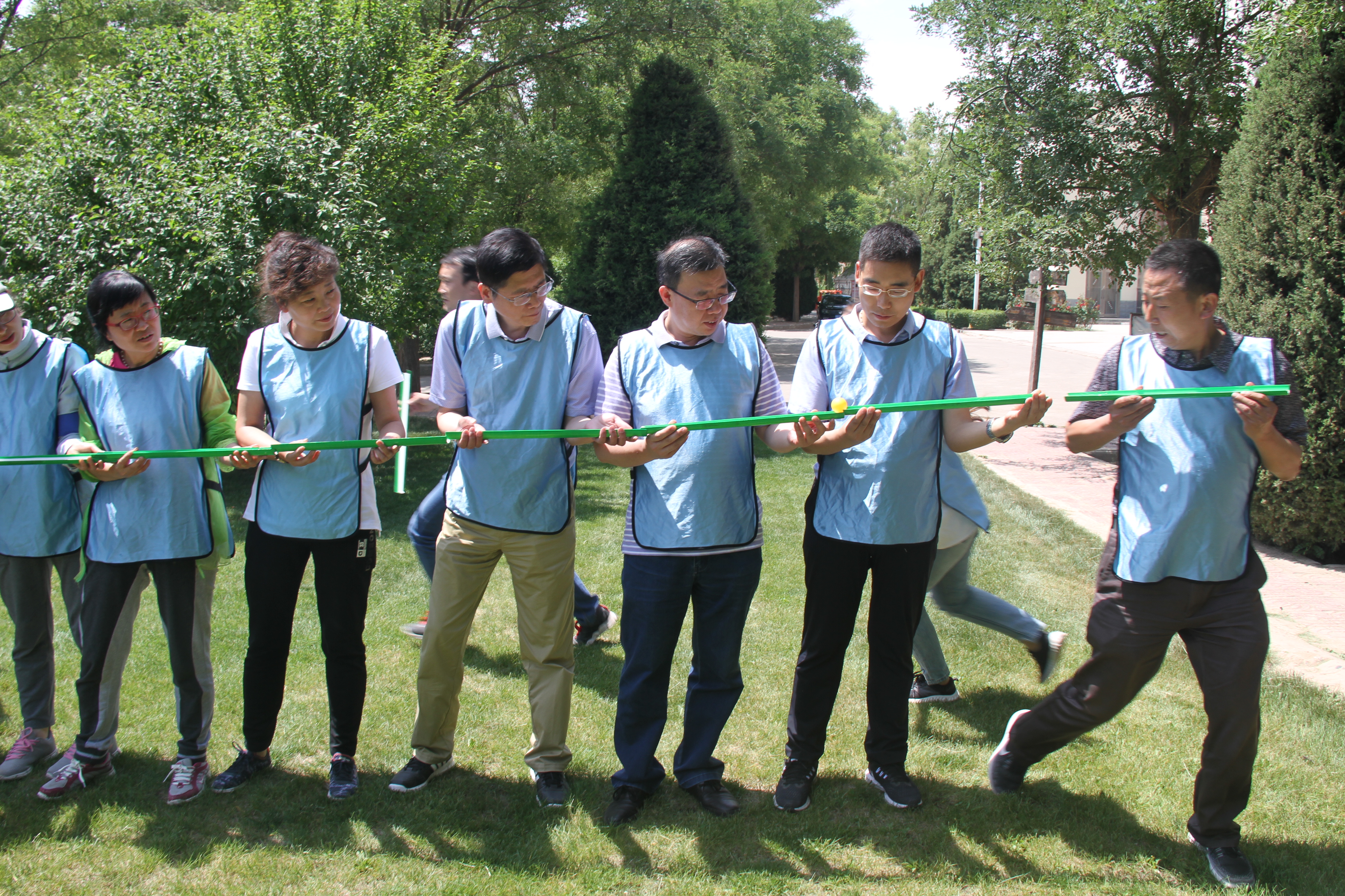 在“支援前線”項目中,大家利用手中的PVC管來傳送兵乓球,模擬戰場上的炮彈輸送,規則要求在輸送過程中,不能出現銜接斷裂,“炮彈”不能落地,否則視為全體人員陣亡,三支隊伍分別進行了模擬訓練,隨后趕赴“戰場”,大家全神貫注,將手中的兵乓球視為真“炮彈”,小心謹慎,配合有序,最終,三支隊伍都順利將“炮彈”輸送到前線。