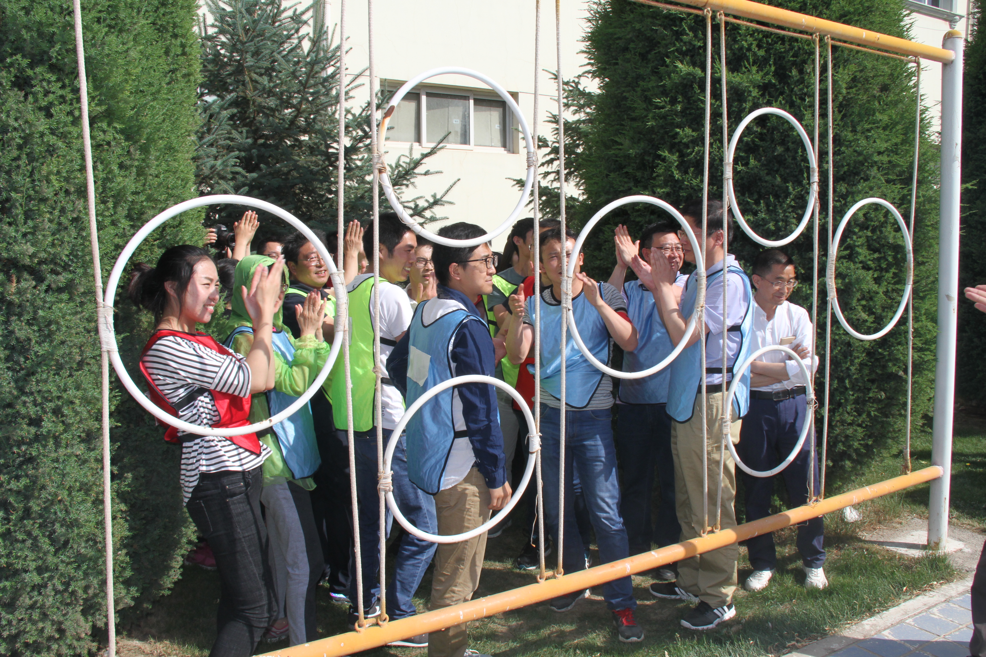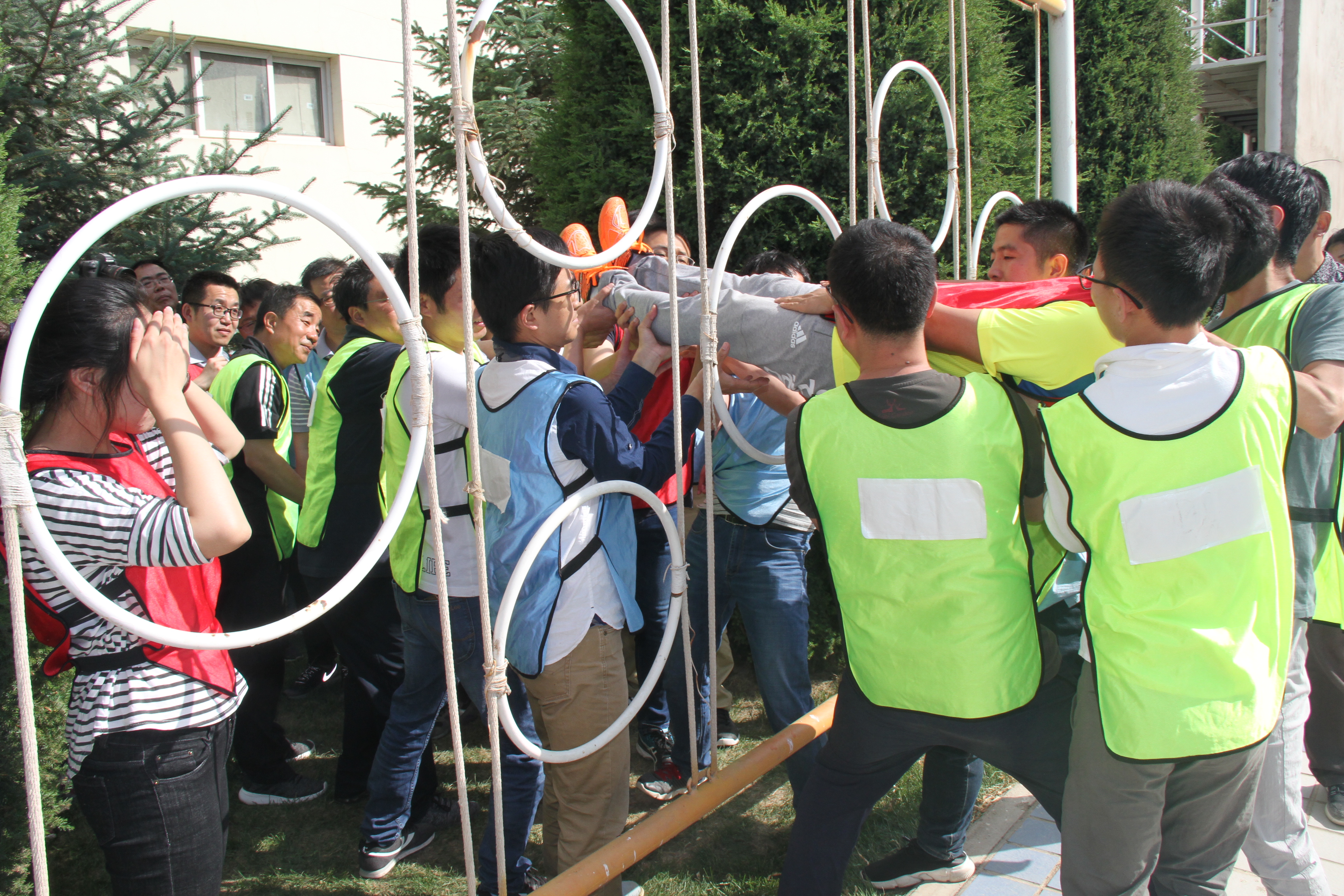 在“生死電網”項目中,規則要求通過團隊配合,全體成員依次安全通過模擬電網,在活動中,任何人身體任何部位不得觸網,所有人不許講話;大家在短時間內進行了溝通和協商,最終確定了通過方案,各自按照分工迅速行動起來,所有隊員不分彼此,已經成功通過的隊員奮力協助未通過的隊員,大家互相奉獻,互相依靠,深刻感受到了團隊力量的強大。每位參訓學員在每個項目都全情投入,互助互信,一起面對困難和挑戰,分享成功和喜悅。
