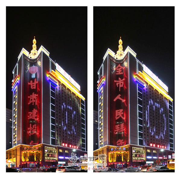 在美輪美奐、閃爍變換的燈光下,“甘肅建投向全市人民拜年和‘投資引領、集中管控、轉型升級、創新發展’十六字企業發展戰略,展示了甘肅建投精英匯聚,扶搖直上的現代企業精神理念,腳踏實地、努力拼搏的企業本色。這種將傳統工藝與現代高科技手段相結合的設計方案,不僅體現出甘肅建投蓬勃向上,積極創新的企業精神,也使建工大廈成為區域內具有獨特魅力的標志性建筑。